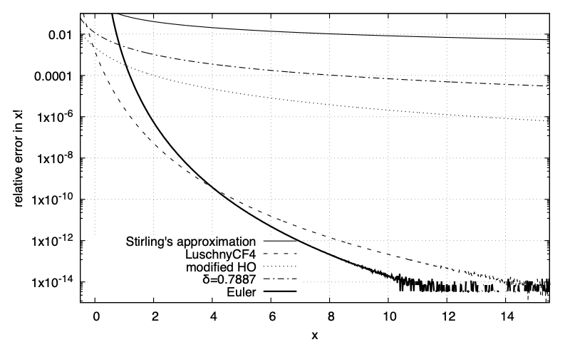 We now show a precise comparison between some of the approximations given here and some very good ones. The one from Luschny looks like the Burnside formula, but with four correction terms in continued fraction form. The one labelled δ=0.7887 is one of the versions that cancel the 1/m2 expansion term. The relatively simple modified HO form derived here is practically identical to 6.1.37 in Handbook of Mathematical Functions including terms through 1/(288z2) in square brackets. It is the best at the smallest values, then the Luschny form is best until about x=4. The Euler-Maclaurin formula result ('Euler') is the best above x≈4 and rapidly approaches floating point precision above x=10. It is amusing that the simple form approximates the factorial function well to x values as low as -0.5 (gamma function argument of 0.5).