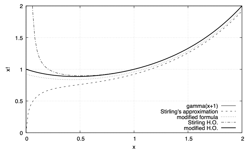 Behavior of the factorial function and approximations from 0 to 2. The correct value of 0! is 1. Stirling's approximation gives 0. The higher order (H.O.) version of Stirling's approximation diverges near zero, but agrees much better than the original version as x approaches 0.5. The modified formula is a decent approximation with an offset less than 8% throughout this range. The H.O. version of the modified formula is nearly indistinguishable from the correct value throughout this range.