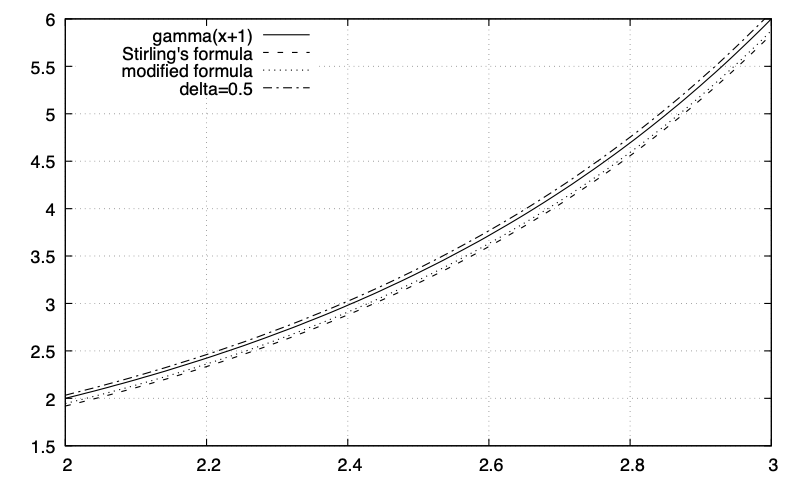 The following plot shows a comparison of these approximations with the gamma (factorial) function from 2 to 3. First, it is somewhat remarkable how well they both do at such small values of n, since derivations generally assume large values of n. The relevant factorials are obviously 2!=2 and 3!=6. Stirling's approximation gives 1.9190 and 5.8362, with errors of -4.0% and -2.7%. The second formula, expressed in terms of n+1, gives 1.9454 and 5.8765, for errors of -2.7% and -2.1%. There is a much more remarkable difference at n=0. The true value is 0!=1. Stirling's approximation gives 0. The modified formula gives .