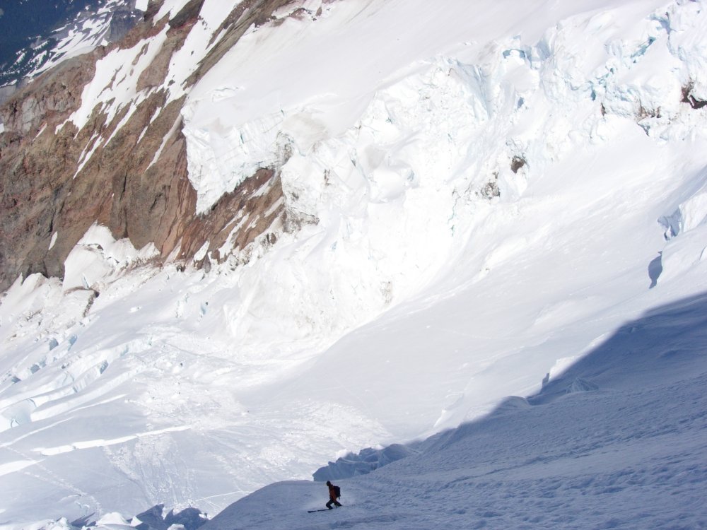 A small, final traverse to skier's left took us below the bottom of the North Ridge ice cliff, onto softer west-facing slopes. Dave followed carefully, finishing with the comment, "That's the most sidestepping I've ever done." We cut a wet slide on the steep slope above the Coleman Glacier. Beatiful steep turns to the bergschrund, a traverse of the Coleman Glacier, and wonderful slush turns in the gullies below the Hogsback took us to timberline and finished the skiing.