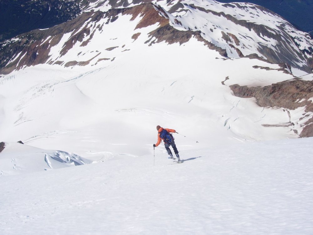 (Added circa 2010 when I lived in Vancouver BC) Although I was quite satisfied to have descended the complete North Ridge on skis, I still suspect that someone who caught it "just right" could descend the whole thing on skis without even sidestepping: the ultimate vision of perfection. Please tell me about it if you are so fortunate! The northern aspects of Baker sing a siren song to me in Vancouver now and then, so maybe I'll take another run at it one of these days...
